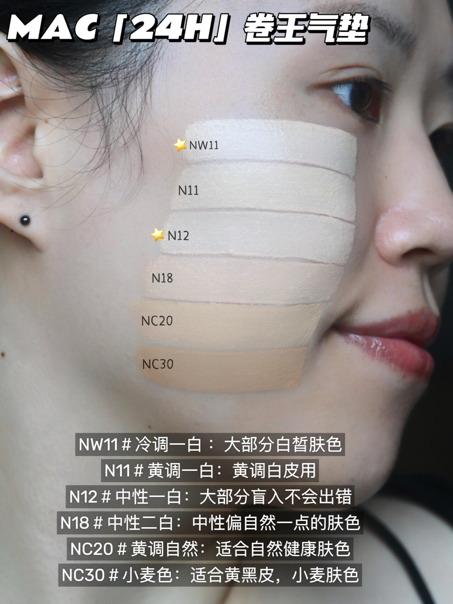 卷王之王❗️MAC家卷王气垫选色指南 对于气垫,我的要求一向会有点严格,我并不喜欢过于干或者过于滋润的,这样的类型一般都是需要一定的上妆手法,可能还需要搭配其他的产品去配合,这样就失去了气垫应该有的简洁快速的功能了 MAC家今年新出的卷王气垫意外的让我看对了眼,妆效有种六边形战士的感觉,既有一定的遮瑕度,但是又有一个微滋润的状态。完全是六边形战士,并不是很局限于肤质,我觉得大部分肤质都很合适 🅾️MAC卷王气垫色号参考🅾️ ⚫️Nw11#冷调一白:色调略微偏冷,适合冷白皮或者瓷白皮,喜欢白皙妆效的可以考虑它 ⚫️N11#黄调一白:正儿八经的黄调,适合黄1-1.5白,喜欢提亮的黄二白也没问题,我用起来微微提亮正正好 ⚫️N12#中性一白:一个中性的色调,适合大部分的白皮 ⚫️N18#中性二白:色调稍微偏粉,适合偏自然的肤色,大部分自然肤色都合适 ⚫️NC20#黄调自然:黄调自然偏暗肤色 ⚫️NC30#小麦色:适合黄黑皮,小麦色 遮瑕力对于我来说太受用了,哪怕是我脸上的红血丝都能帮我遮得住,小瑕疵斑点这种就更不用说了 妆效扒脸,就算是防水防汗也不在话下,最喜欢的还是它整体的质感,不过分油腻,不过于雾面,不需要过多的去配合它,适应它。 总结来说这个卷法,我喜欢 |