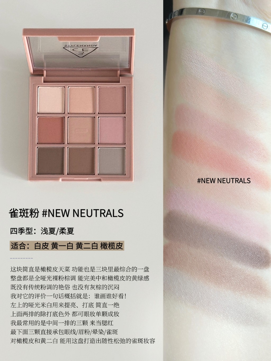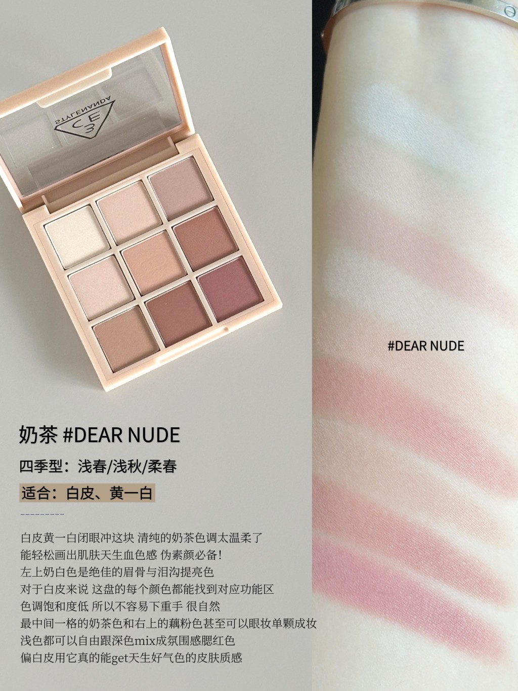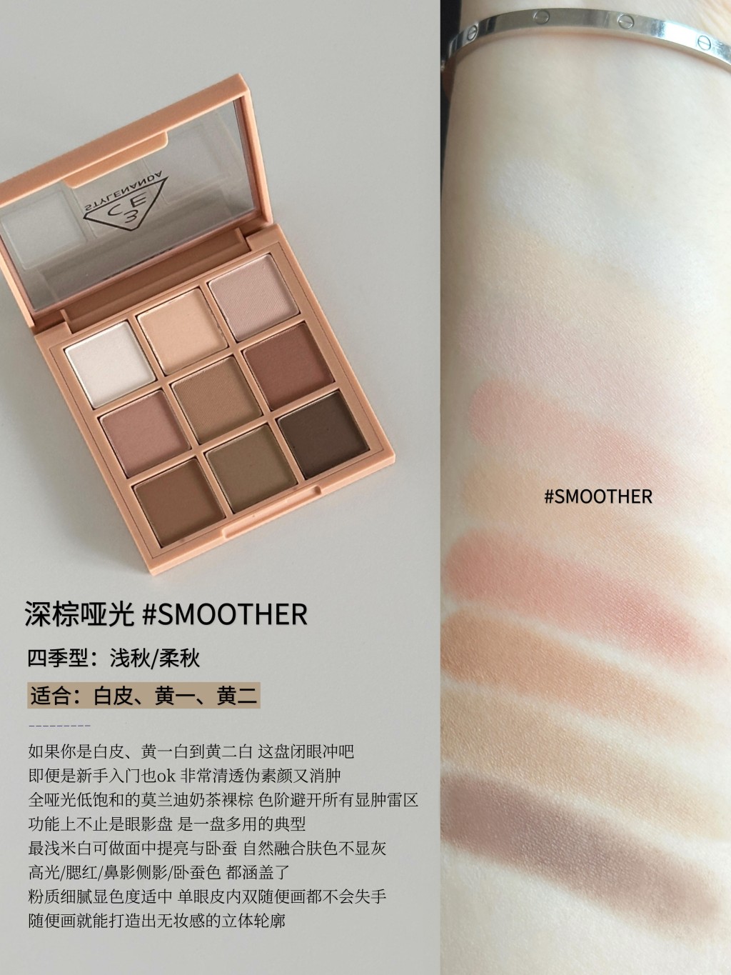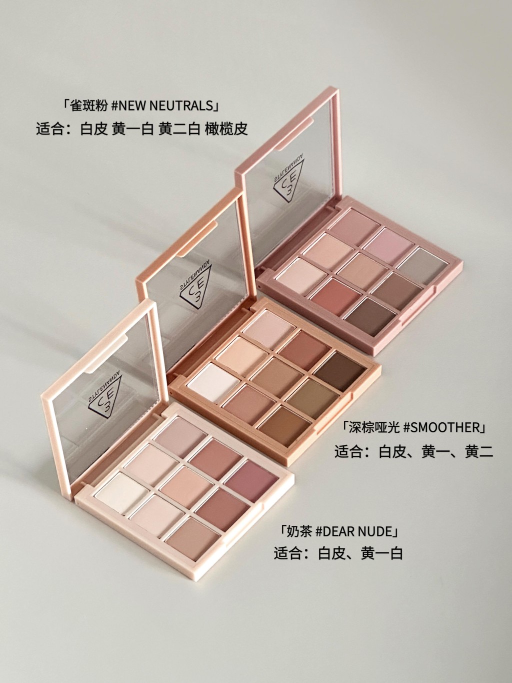 早八人的通勤MVP盘🎧3CE不同肤色怎么选 早八通勤人都会懂 总觉得早上时间不够用 化妆成了最麻烦的事 我翻来覆去用了大半年 终于摸清了3CE这三盘九宫格的门道 它们其实根本不只是眼影 带一盘出门简直功能多多!! 今天来掰开揉碎说说我最爱的三块全哑光通勤神盘 一篇教会你们不同肤色怎么选 什么色块怎么用 用对了真的能让你多睡二十分钟还能漂亮出门 -- ▫️深棕哑光 #SMOOTHER 适合:白皮、黄一、黄二 四季型:浅秋/柔秋 不挑皮 全哑光低饱和的莫兰迪奶茶裸棕 清透伪素颜消肿盘!新手入门必备 全盘无废色的黄皮本命盘 . ▫️奶茶 #DEARNUDE 适合:白皮、黄一白 四季型:浅春/浅秋/柔春 清纯温柔的奶茶色调 偏白皮能轻松画出肌肤天生血色感 . ▫️雀斑粉 #NEWNEUTRALS 适合:白皮 黄一白 黄二白 橄榄皮 四季型:浅夏/柔夏 全哑光无花果裸粉棕调 功能齐全 一盘即可搞定全妆 对橄榄皮和黄二白 更能用它打造出随性松弛的雀斑妆容 |