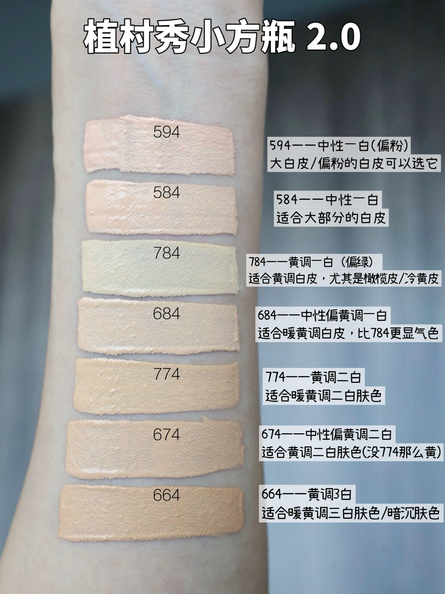 植村秀小方瓶2.0试色测评 旧款小方瓶是真好用呀~ 说起轻薄型持妆粉底它还是响当当的。 带妆一整天下来,都是美美得不暗沉、细节也好看得不像话~ 新版的2.0我就想说,更新得很好,建议以后别更新了。 好用还是好用的。持久度上跟老版差不多很不错。刚上妆的状态也一样都是薄感的柔雾妆效好看的。 就是带妆久了的话没有老版那么经得起看。卡纹更明显一些。 属于单拿出来也是好用的粉底,但跟老款比又没那么让人叫绝了。 色号也是跟老款稍有区别,我自己用的774就没有老款那么白净。 试色及选色建议: 594——中性调一白(偏粉)——白偏粉的肤色可以选它 584——中性调一白——适合大部分白皮 784——黄调一白(偏冷/偏绿)——适合黄调一白,特别是橄榄皮/冷黄皮,适合修正泛红肤色 684——中性偏黄调一白——适合暖黄调的一白肤色,比784更暖,会显得更有气色(我用它有显著提亮) 574——中性调二白——适合不白也不黑也不怎么黄的肤色 774——黄调二白——适合黄二白肤色(我用它刚刚好没什么提亮) 674——中偏黄调二白——适合黄调二白肤色。(比774黄调少一点,亮度差不多) 664——黄调三白——适合黄调三白肤色,暗沉肤色。 |