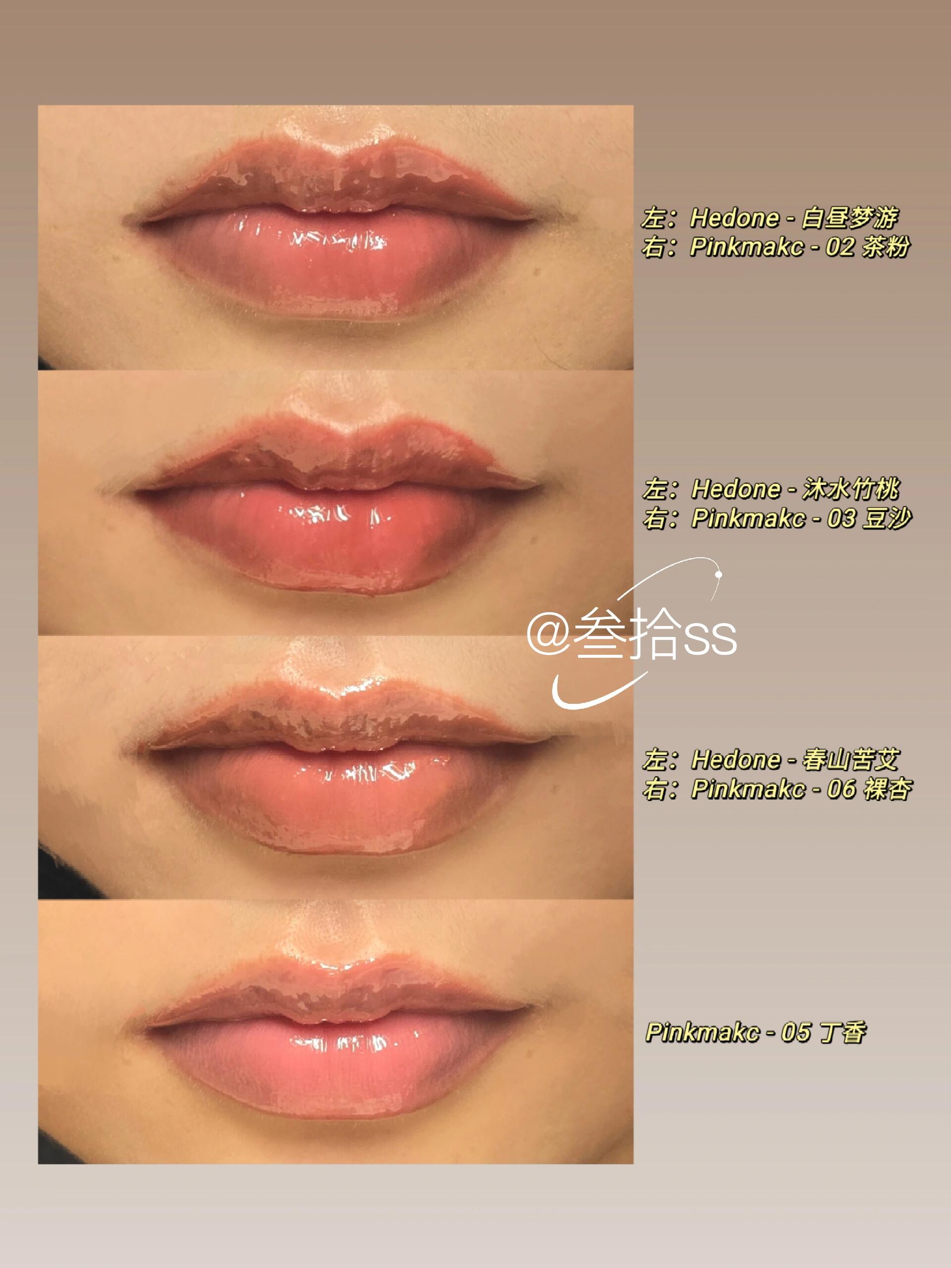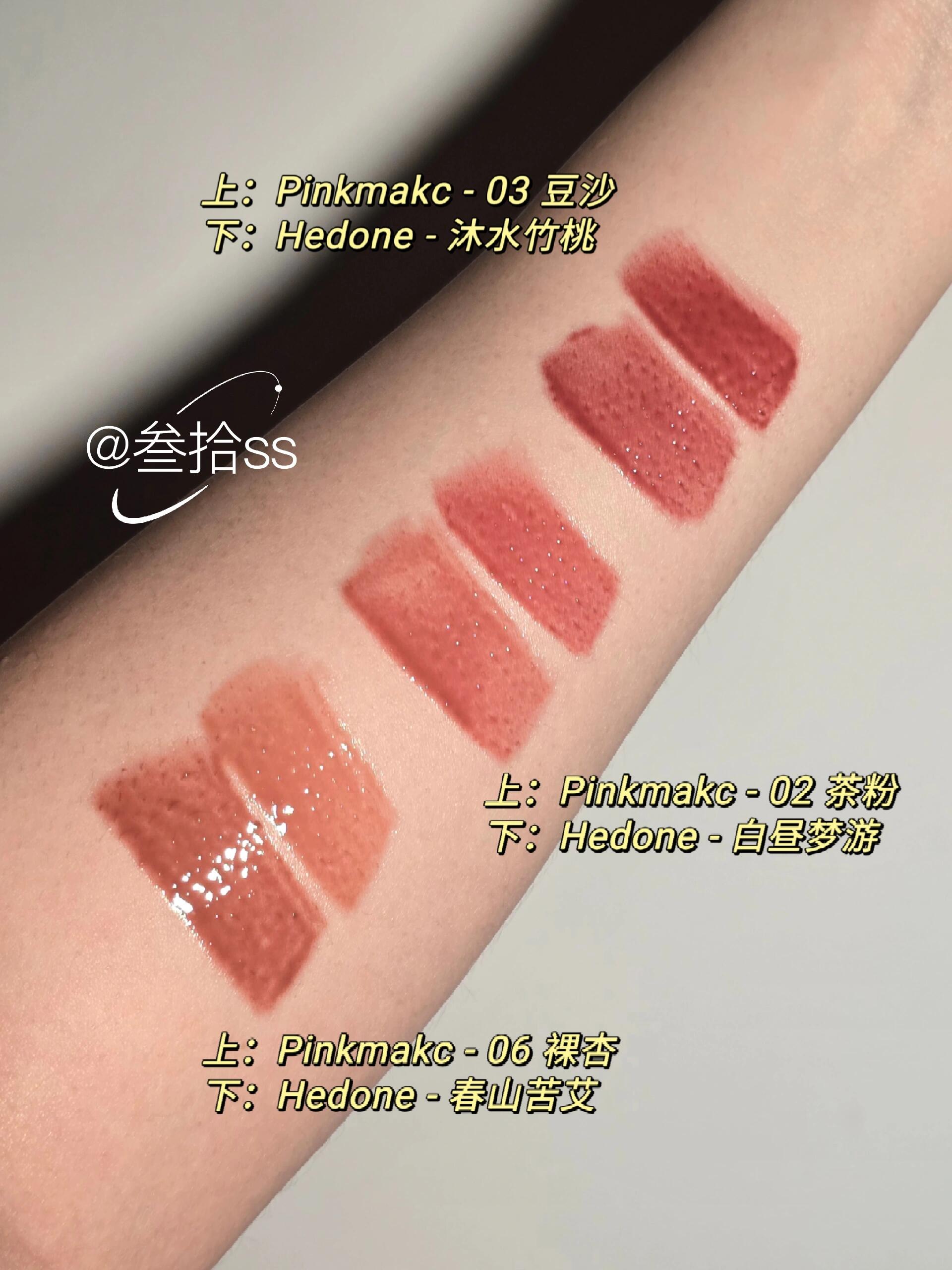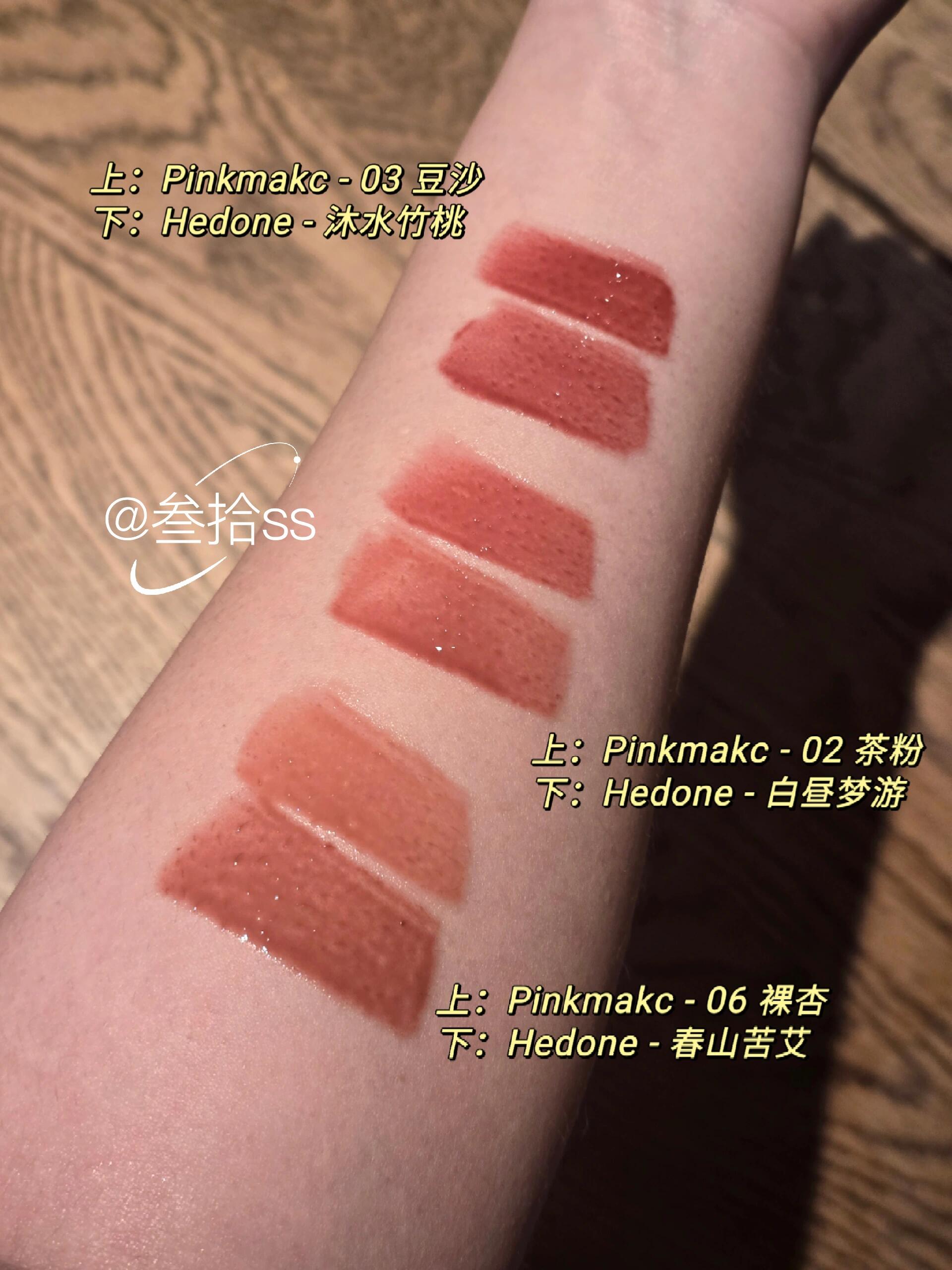 彩妆试色|Pinkmakc唇釉合集(含上嘴试色) 我喜欢的水光唇釉,爱一个停产一个 Pinkmakc据说是收了Hedone配方 找同工厂做的,好奇买来试试 【味道】 淡淡的薄荷味,没有Hedone那么重 但是额外有一点奶糖味,甜甜的 【质地】 Pinkmakc的刷头每次沾取的量少一点 涂着手感更干一点,但是上唇滋润度差不太多 颜色覆盖力更强一点 玻璃唇效果差不多,Pinkmakc的光泽感稍微强一点 【颜色】 对比试色详见p4-6 我手头Hedone不多,挑了接近的颜色比对 对比色号组为 02 茶粉 vs 白昼梦游 03 豆沙 vs 沐水竹桃 06 裸杏 vs 春山苦艾 单看的话,个人比较喜欢05和06 尤其是05冷冷的,很适合橄榄皮 我没有唇炎,不清楚修复效果的差别 不过从质地和颜色来看都还不错,会回购 期待推出更多例如05的独立新色 #彩妆新品 #无滤镜试色 #口红试色 #hedone唇釉 #hedone春山苦艾 #hedone白昼梦游 #hedone沐水竹桃 #pinkmakc |