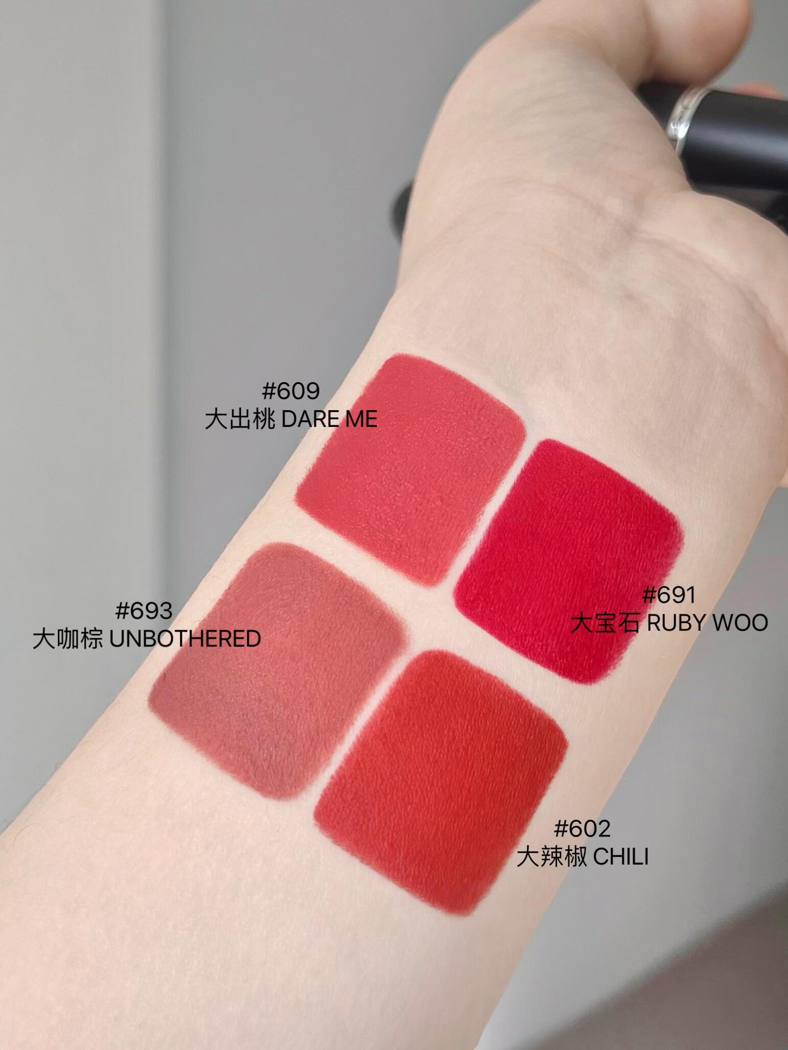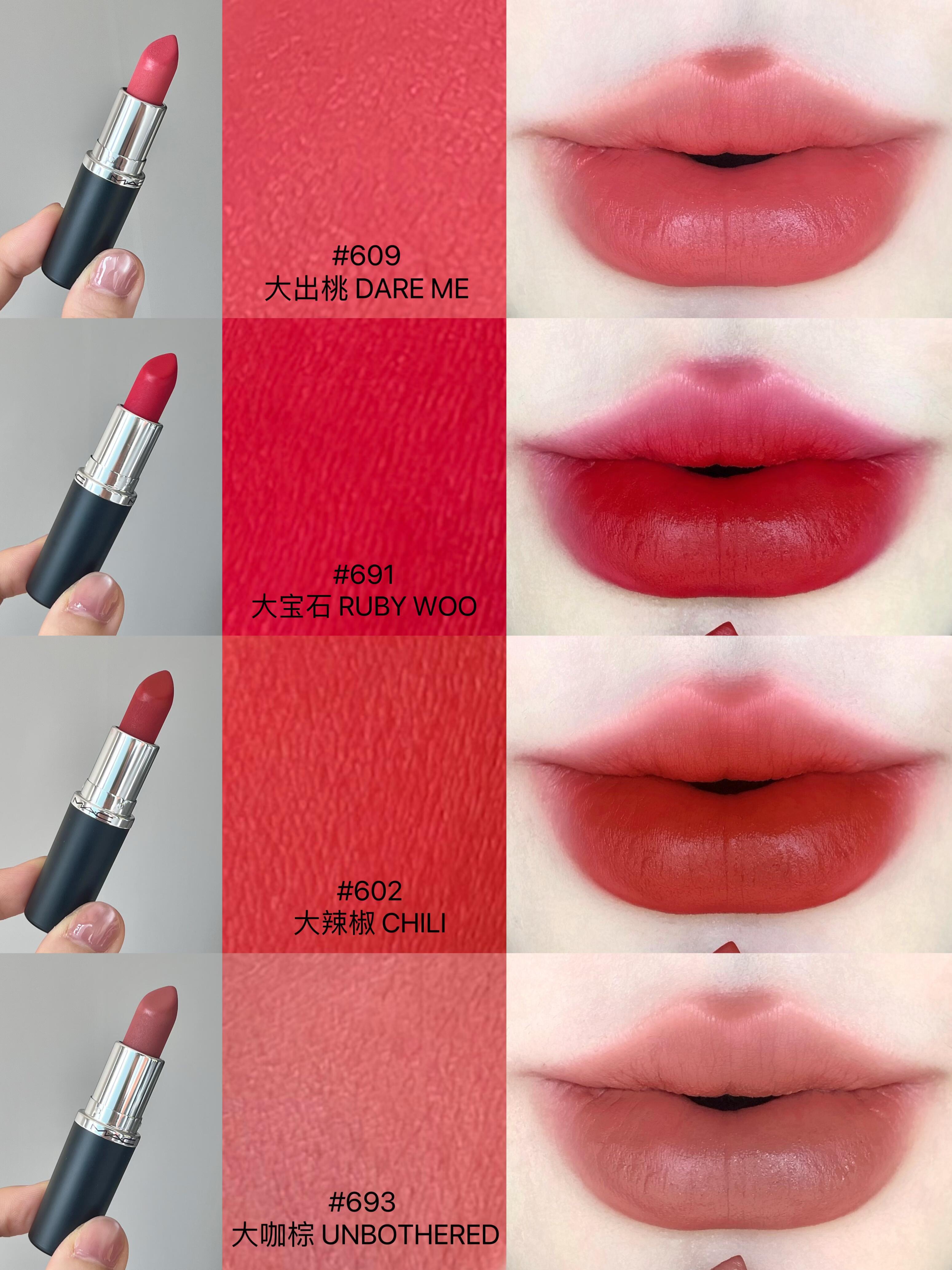 闭眼入的新年开运色!!! MAC哑光子弹头还有小宝没入嘛? 是不是人手一支了!!是不是真的很好涂!! 🥥质地是哑而不干的,而且显色度真的不用多说 挑了4支适合新年涂的颜色:D - #609大出桃 DARE ME:可爱又减龄的蜜桃粉,不会荧光 🍧很适合早八、约会的宝宝~ #691大宝石 RUBY WOO:MAC白月光色号!非常经典的蓝调正红色,明艳又显白~ #693大咖棕UNBOTHERED:偏暖调的低饱和茶棕色,新手入门级别的口棕,薄涂温柔,厚涂秒变高智美女。 #602大辣椒 CHILI:经典显白的复古红棕色,在秋冬绝对的显白,高级又百搭,几十年后再涂也还是会很喜欢! - #口红试色#无滤镜口红试色#MAC#MAC子弹头 #mac惊喜盒子#MAC693#MAC609#MAC602#MAC691 |
