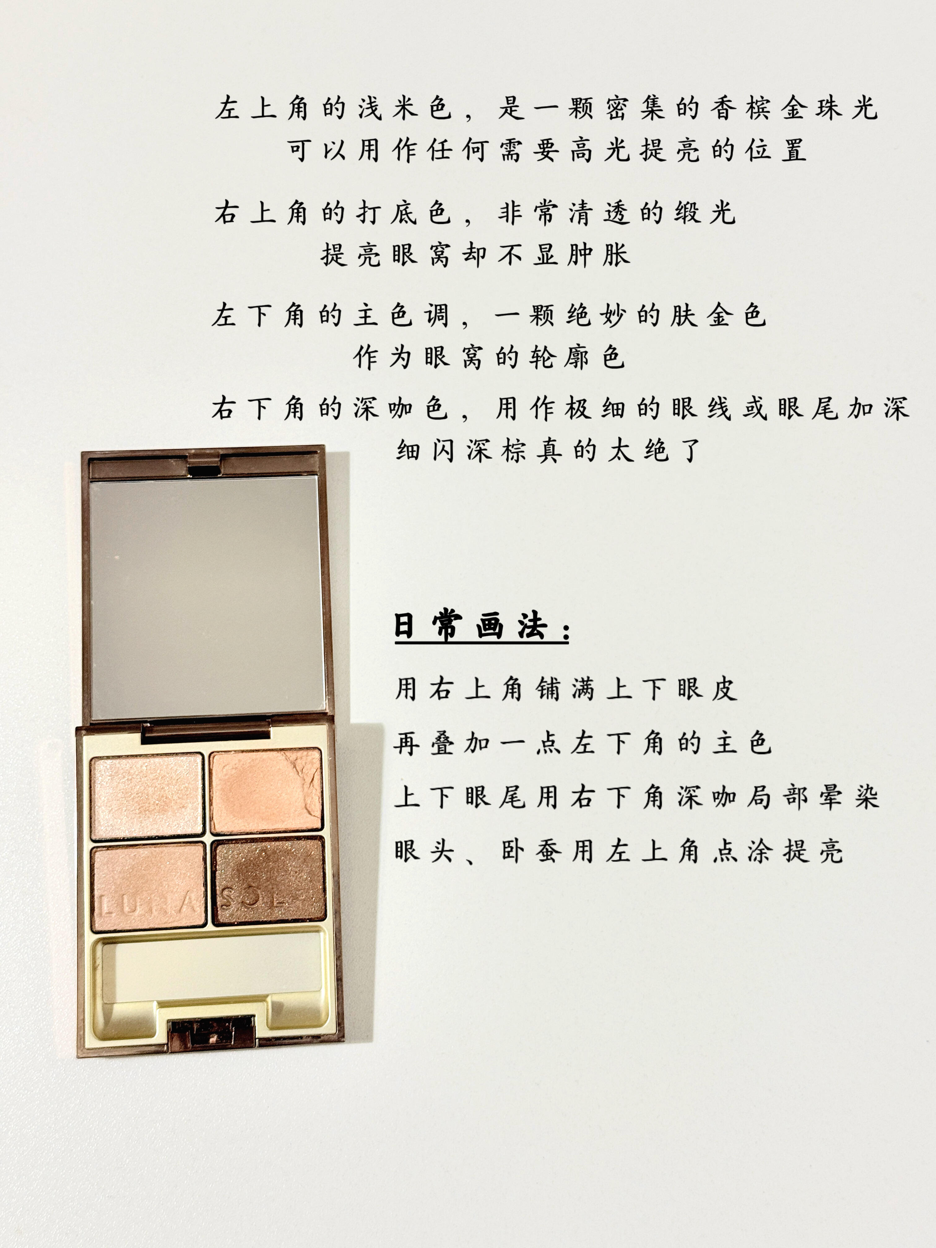 淡人伪素颜眼影的终极答案 作为日系眼影的忠实用户,从Suqqu、CPB一路试到Lunasol,最终在化妆包里屹立不倒的,竟是这盘看似“平淡无奇”的Lunasol 01 Beige 这盘的妆效和特点总结起来就是:平平无奇,无中生有。初看似乎是毫无波澜黄棕大地盘。上手一试,才知道什么叫“于无色处见繁花”。 它的粉质是典型的日系贵价该有的水准——细腻、软糯、清透。 独特的缎光感是我钟爱它的原因。不是欧美系那种高调的金属闪片,也不是哑光的纯粹雾面。而是在光线转动间,透出如丝绸般细腻、湿润的光泽,仿佛眼睛本身透出的健康光彩。 这盘01 Beige的核心魅力,在于它完全服务于优化原生条件的日系美学。不追求改头换面的色彩冲击,而是致力于双眼的轮廓”抛光”。 1️⃣左上角的浅米色,是一颗密集的香槟金珠光,可以用作任何需要高光提亮的位置。 2️⃣右上角的打底色,非常清透的微微缎光,提亮眼窝却不显肿胀 3️⃣左下角的主色调,一颗绝妙的肤金色,作为眼窝的轮廓色 4️⃣右下角的深咖色,我通常用作极细的眼线或眼尾加深,细闪深棕真的太绝了 我通常用右上角色铺满眼皮,再叠加一点左下角的主色,上下眼尾用右下角深咖局部晕染,眼头、卧蚕用左上角点涂提亮。五分钟就能获得一双清澈有神、充满高级感的眼睛。 关于这盘,我只推荐给两类人: 1.化妆新手,需要一盘配色安全、粉质优秀、不易出错的入门贵价盘。 2.喜欢大地色地母系妆容的会化妆的姐妹,以及眼窝凹陷需要提气色的30+的职场姐姐 它不适合喜欢浓郁色彩、强存在感眼妆的姐妹。因为它的色阶拉不开,所以在眼皮上再怎么样也化不出花来。不过目前一百多就能买到,还算可以了。 有姐妹说这盘和suqqu的03光幕很像,我觉得光幕更黄更浓郁,我后面会出光幕的笔记~ 总结来说,Lunasol 01 Beige不是一盘能让你改头换面的眼影,它懂得留白,懂得克制,用高级的缎光,勾勒出眼睛本真神采。这种“less is more”的智慧,反而让它成了我化妆包上屹立不倒的存在。 #生活需要分享欲 #眼影替代色 #消肿眼影 #lunasol眼影 #大地色眼影 #日系眼影 #缎光眼影 |