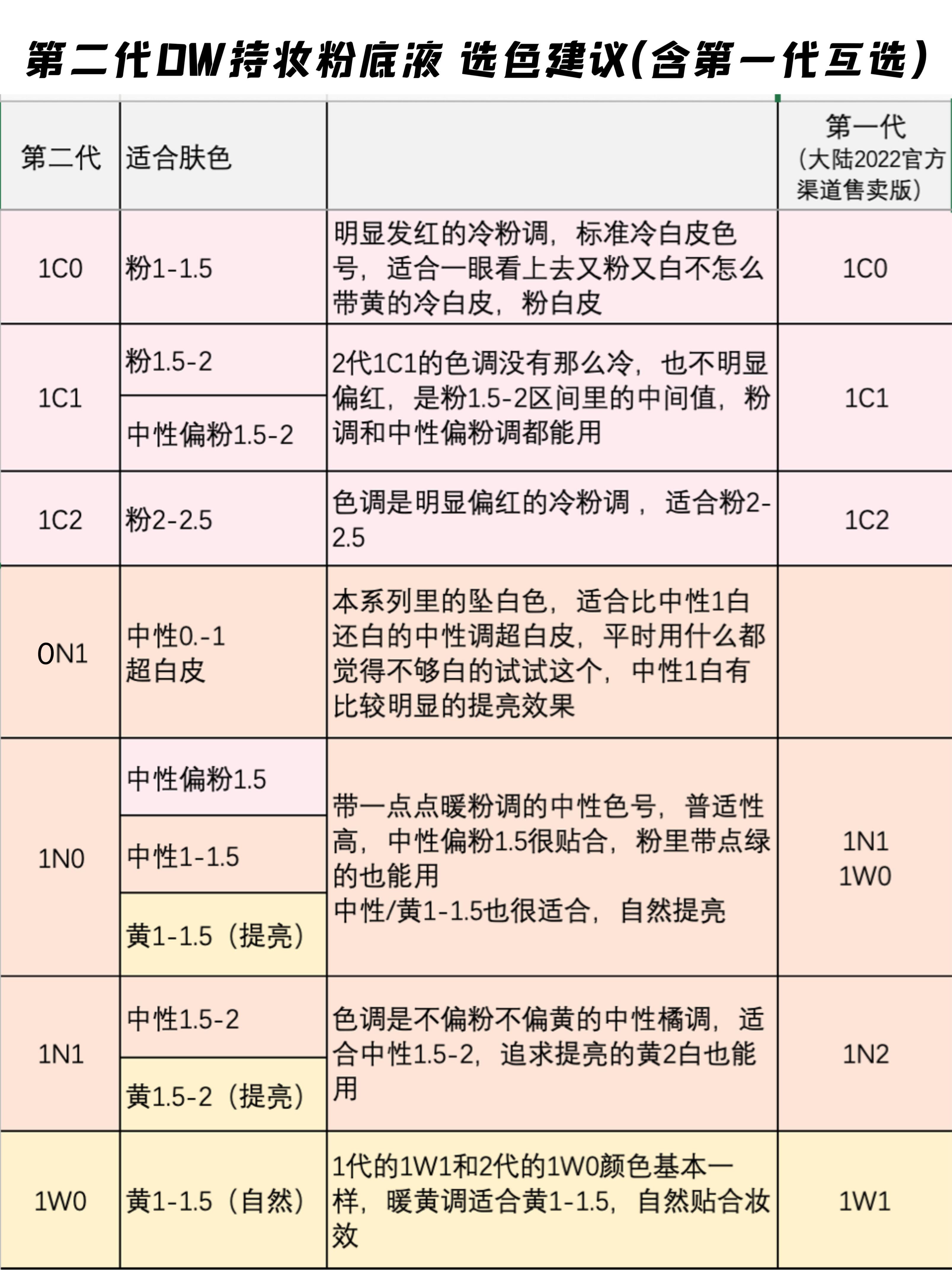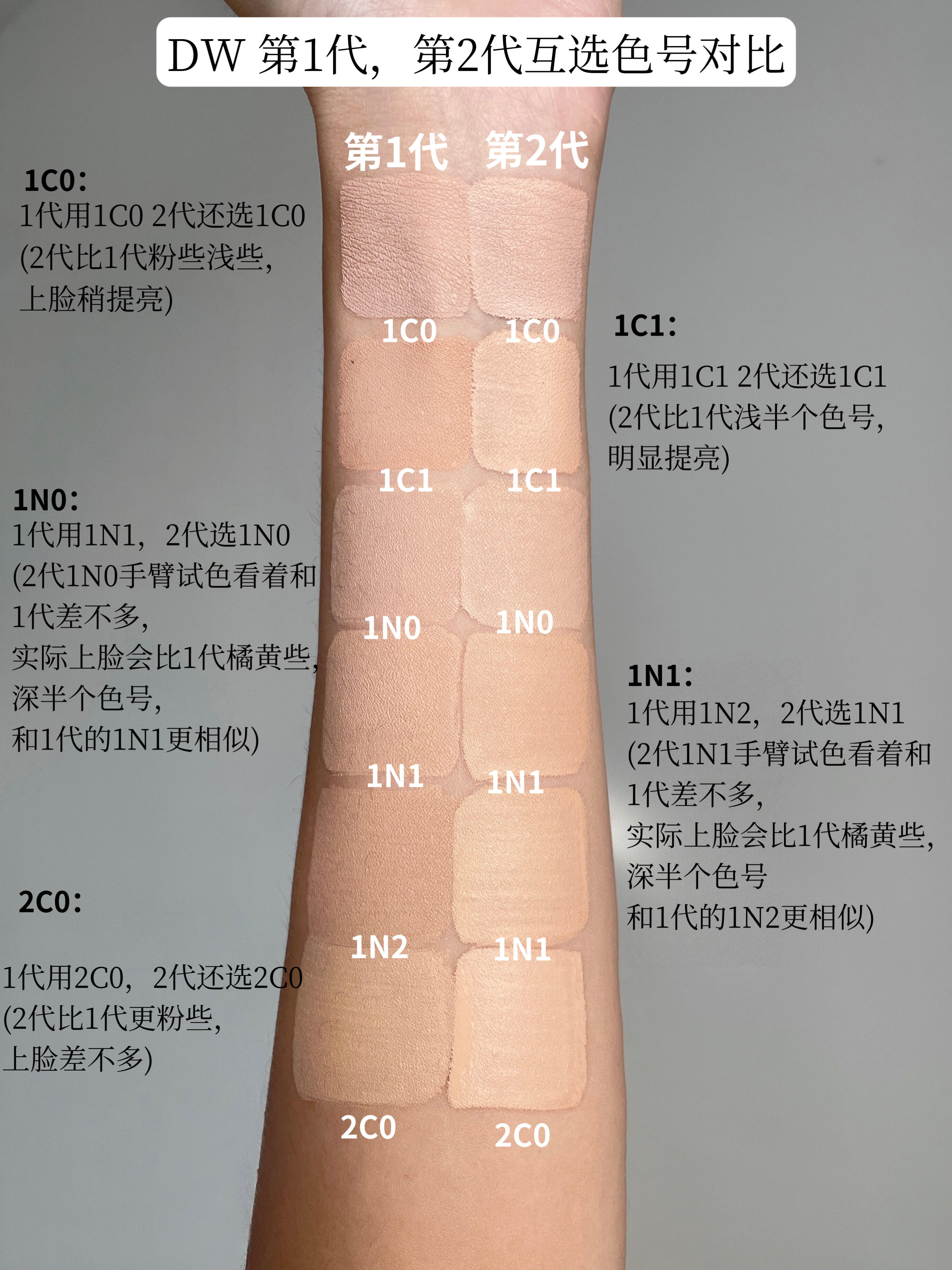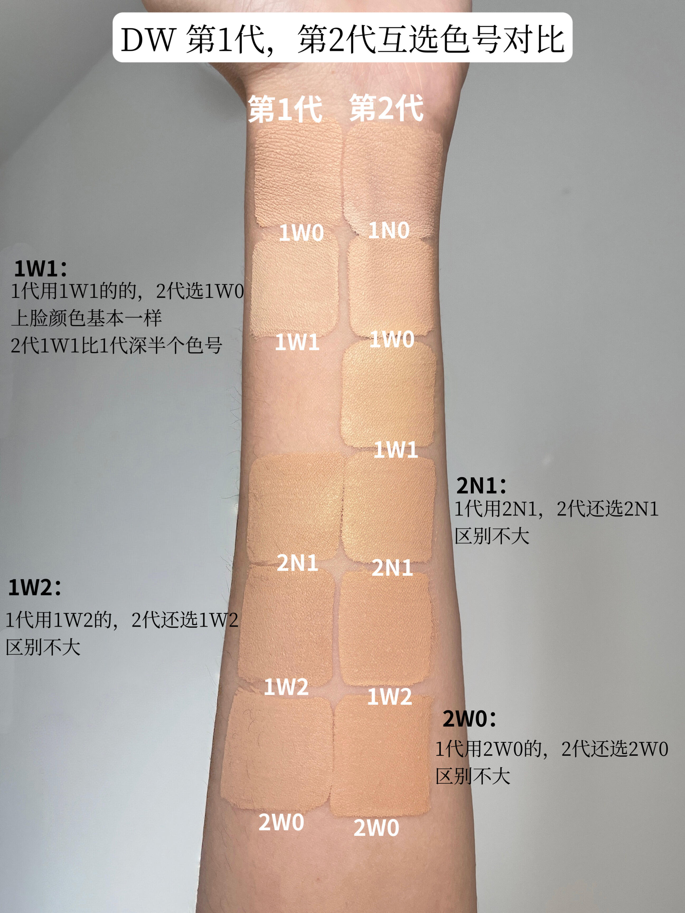 「全色号」纠结第二代DW粉底液选色的进。 本人肤色:中性偏黄1.5-2(黄调里带点绿,黄二白区间) 本人肤质:混合皮 DW粉底液一代是畅销全世界十几年的粉底液,也是国内国民度很高的持妆粉底液,"油皮亲妈""持妆的神",高持妆强控油强防蹭的经典代表性产品 色号调色也是标杆级别,专业度毋庸置疑,全球几十个色号,肤色模版教科书,我当年学习肤色辨别的时候,就给了我很多参考。 新升级的第二代DW持妆粉底液,我是带着膜拜学习的态度,看看经典之作升级还能带来哪些震感。 讲真,一代这些年我夏天也经常用,色号质地都很适配,但它有一个特点:一到8月底换季就开始干卡了,比日历都准,只要我用DW一代开始拔干卡粉,我就知道…该换季了,是个季节性非常强的产品 二代升级后,我觉得很大变化就是季节性没那么强了,冬天室内用会柔和很多,没有那么硬核了,二代首先粉质变得更细了,是那种高延展得慕斯质地,很好推开 上脸也感觉不到膜感和粉感,因为二代采用了软硬双性成膜技术,不仅更加得扒脸服帖,还更加得轻薄透气,因为粉足够细,有瑕疵的地方叠涂也不会卡粉。整个出来的妆效是没有粉感的柔雾肌妆效,比旧版那种奶油肌更加灵动些 持妆8小时妆面也挺完整的,没有脱妆和斑驳,关键是里面新增的水油平衡双萃,一整天也不会感到紧绷拔干,微微出油反而底妆会更加的融合。一代冬天我是不可能持妆8小时的~ 🤎试色选色 调色审美和一代差不多,依然非常多元,全球70多个色号,国内引进了26个,加了一个超白冷白皮用的0N1新色。色阶从0-6,国人所有肤色几乎都能找到适合的色号,我从26个里精选出了16个,比较大众化热门的,适用人群比较多的。 还是融肤级贴合型,选对色号可以和肤色融合的特别好,基本没什么色差,也可以根据不同审美需求选适配的色号,像我能用的就有5个色号 一代二代色号有些变化,变化不太大,大多数还都是同色调色阶之内的微调,不影响整体选色。 粉调 1C0,1C1,1C2 中性调 0N1,1N0,1N1,2C0 黄调 1W0,2N1,1W1,1W2,2W0,2W1,2N2,3W0,3N1 橄榄调 2N1,1W1,2N2 #DW粉底液 #第二代DW粉底液 #无瑕底妆 #混油皮 #新品上市 #DW升级 #持妆进阶始终DW #粉底液测评 #色号选择 |